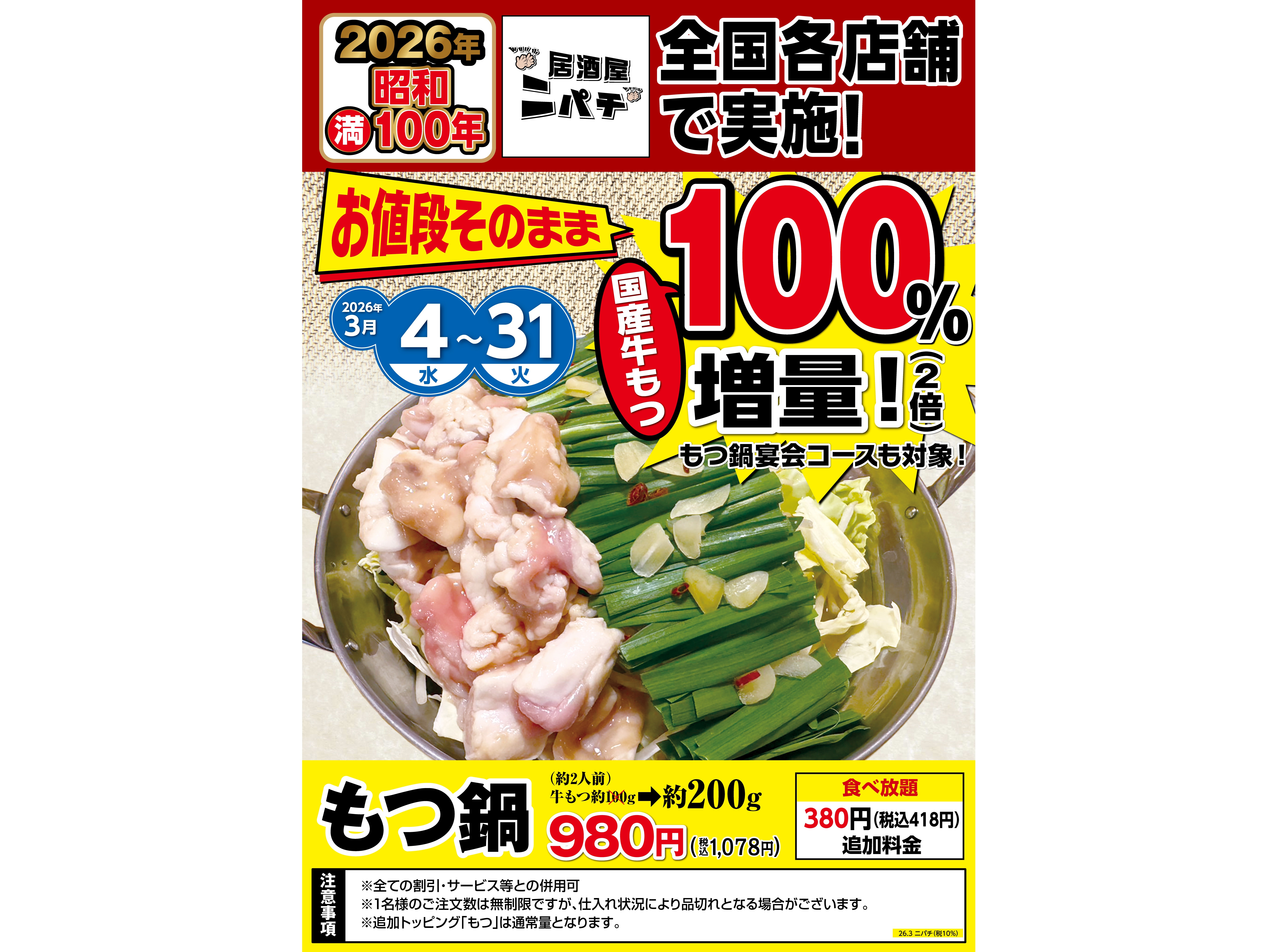 【ニパチ】昭和満100年記念 🎊もつ鍋国産牛もつ100%増量 🍲